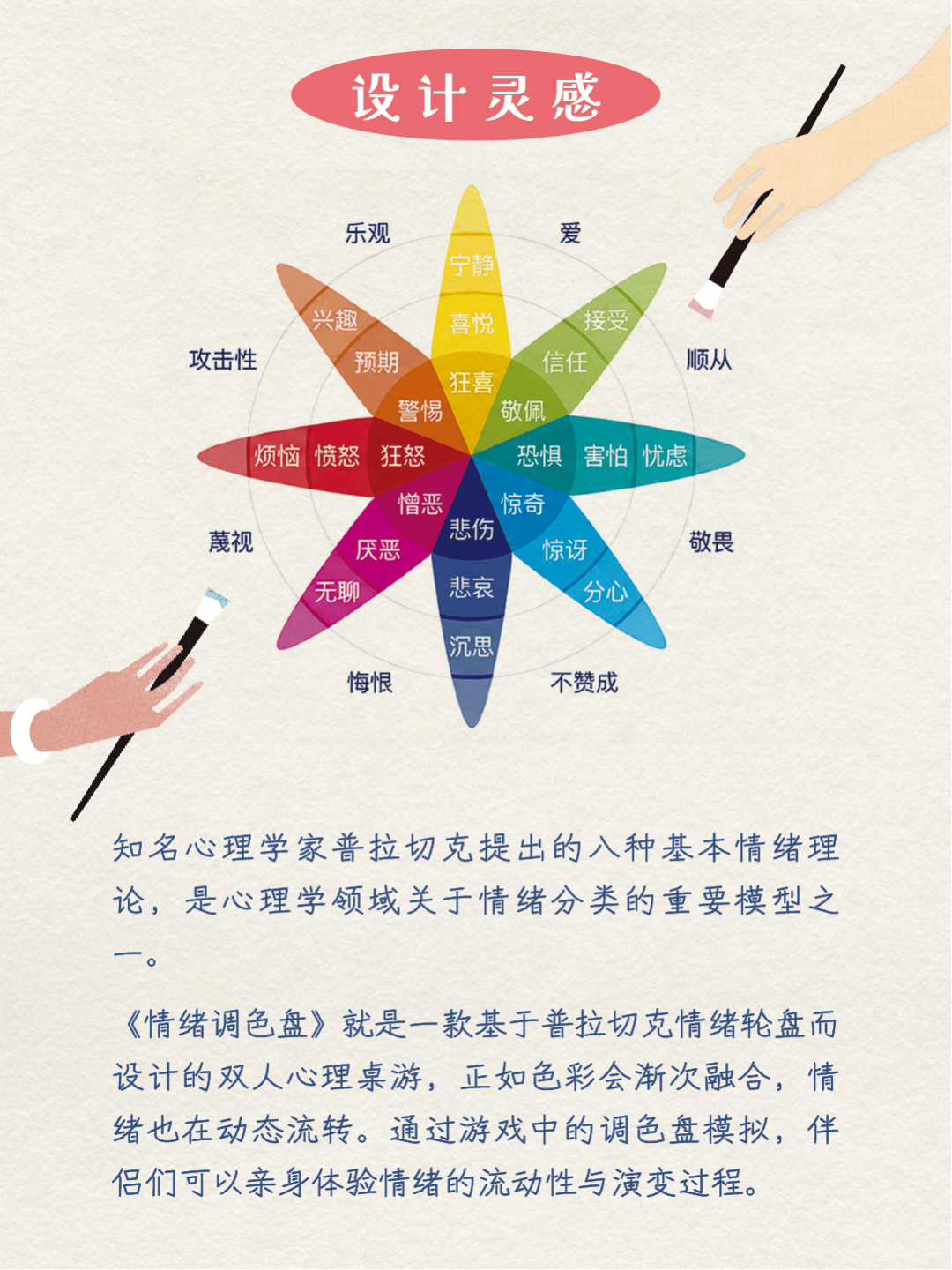 为2人打算这款桌游专,岁以上玩家适合14,0-30分钟单局时长2,家普拉切克的八种根基心绪表面其主旨打算灵感源自出名心境学,分为分别维度该表面将心绪,征强度纵向象,缘到核心从轮盘表,增、色彩加蜜意绪强度递。