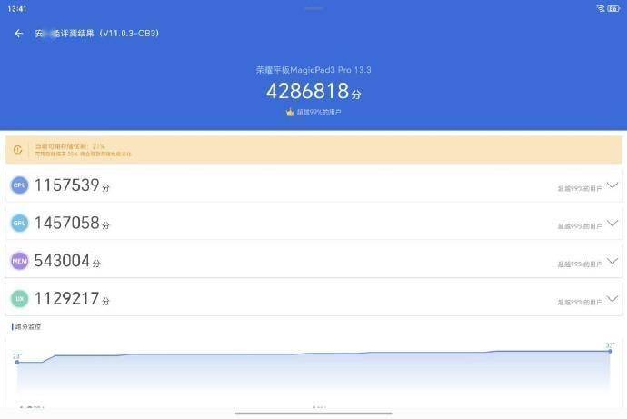 即日曝光的跑分结果激励行业合切名誉MagicPad3 Pro。通正在亲身实测后证据数码博主旺仔百事,储仅剩21%的前提下该设置纵然正在可用存,8万的跑分结果仍能取得42,布的430万官方跑分高度吻合与名誉全场景产物承当人林林公。