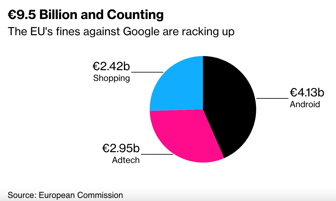 出数十亿欧元的反垄断罚单这已是欧盟第四次对谷歌开。前此,滥用购物方面权利、滥用安卓方面权利及滥用告白方面权利欧盟差异于2017年、2018年和2019年因谷歌,3亿欧元和14.9亿欧元的罚款对其处以24.2亿欧元、41.。中其,罚款后被欧盟常想法院裁定取消2019年的14.9亿欧元。此至,高达95亿欧元的罚款欧盟总共对谷歌处以。