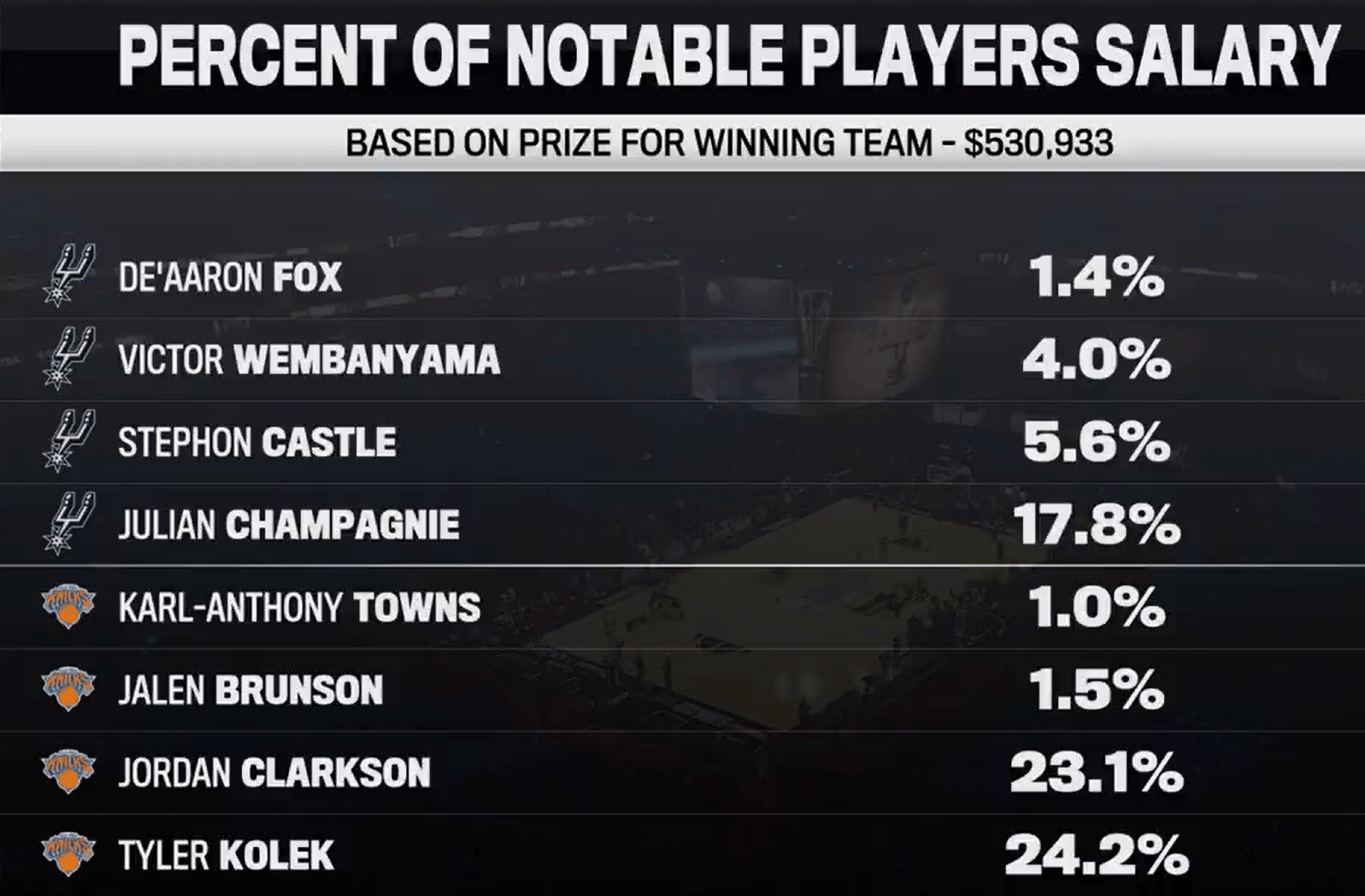 悉据,税前530933美元的奖金冠军尼克斯各名球员将得到。得税前212373美元的奖金得到亚军的马刺各名球员将获。